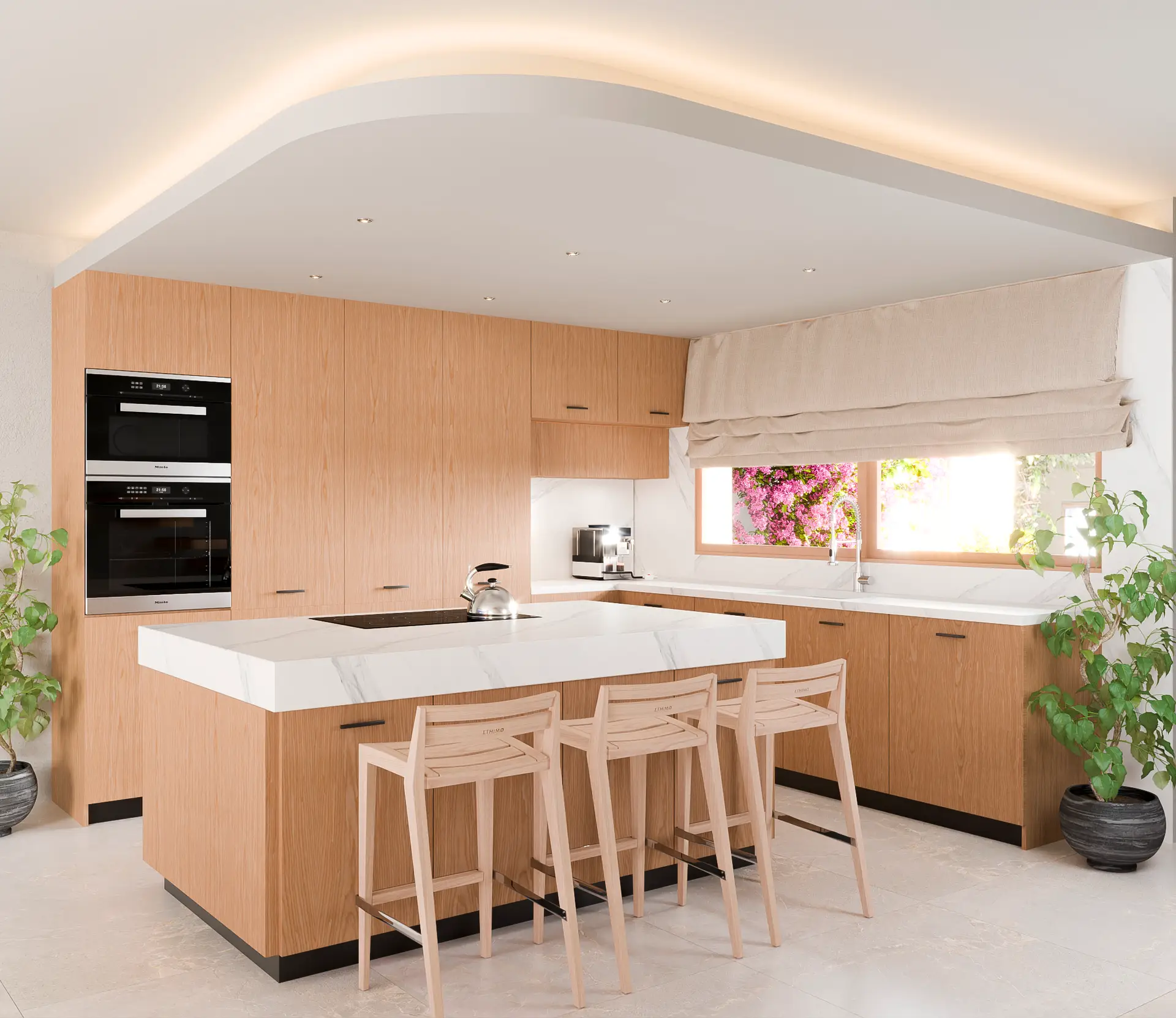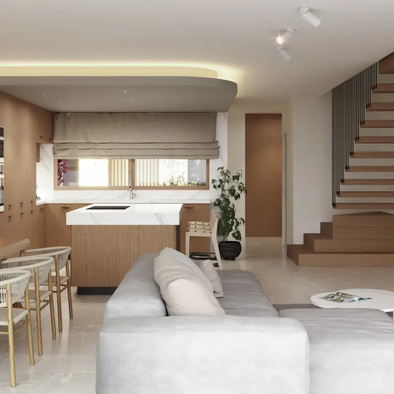 The architecture blends natural materials like stone and wood with modern lines and warm finishes, creating homes that are elegant, timeless, and in harmony with their surroundings. Each townhouse features at least 128 m² of living space, with a bright open-plan living room, large windows, and a modern kitchen with island, all built with high-quality materials and finishes.