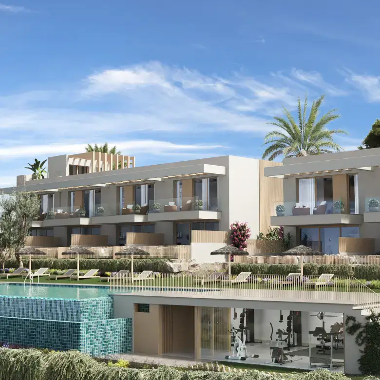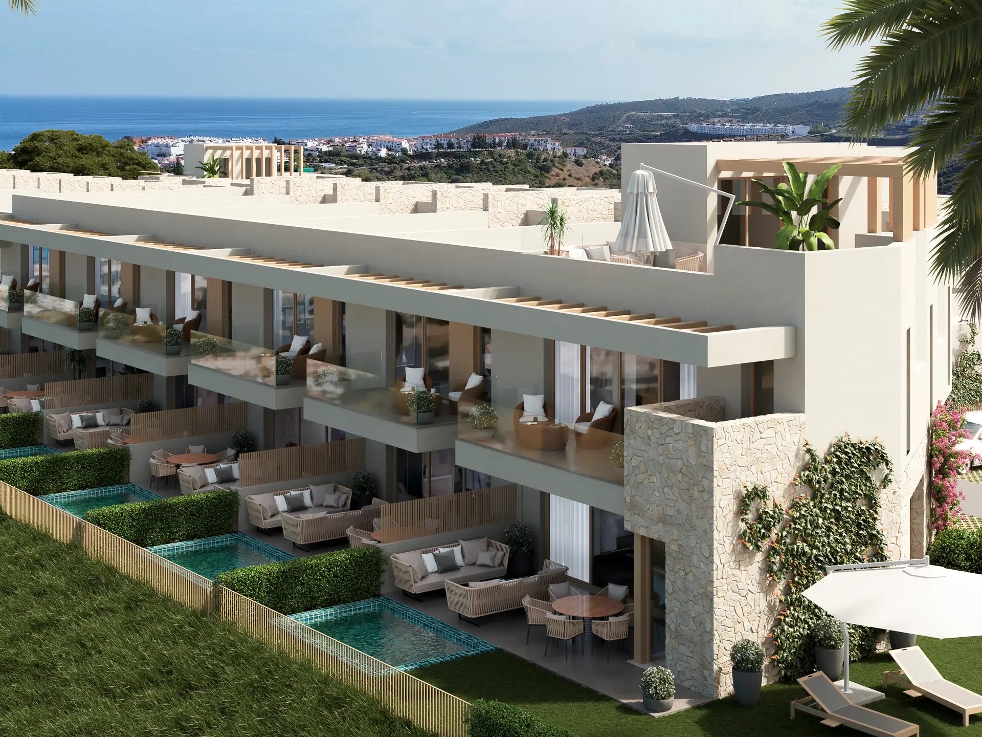 Between Estepona and Sotogrande, in the increasingly popular area of Manilva, lies this exclusive new development of modern townhouses. Surrounded by lush nature and overlooking the Mediterranean, it offers a tranquil yet well-connected lifestyle, just minutes from La Chullera beach and the vibrant marina of La Duquesa.