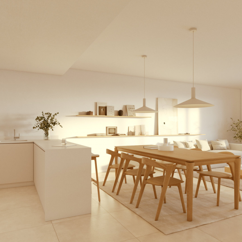 This limited collection of only 18 two- and three-bedroom apartments is distributed across three elegant low-rise buildings, creating an atmosphere of privacy and openness. Each residence has been thoughtfully designed to maximize natural light, privacy, and sea views. The open-plan layout connects kitchen, dining, and living areas, creating a seamless flow that enhances social living and comfort.