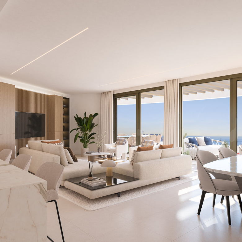 Homes are designed with open-plan layouts, large porcelain flooring, and floor-to-ceiling windows that connect naturally with spacious terraces. This allows light to flow throughout the living room, kitchen, and bedrooms, offering uninterrupted views of the sea and mountains. Cross ventilation ensures a fresh and airy atmosphere all year round.